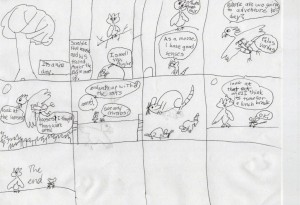During a ride today, Katia was drawing while sitting in the back seat. I knew she was working on something; she kept fussing at me about the bumps in the road. Turns out she was drawing a comic strip. Click the image below to get a better look.