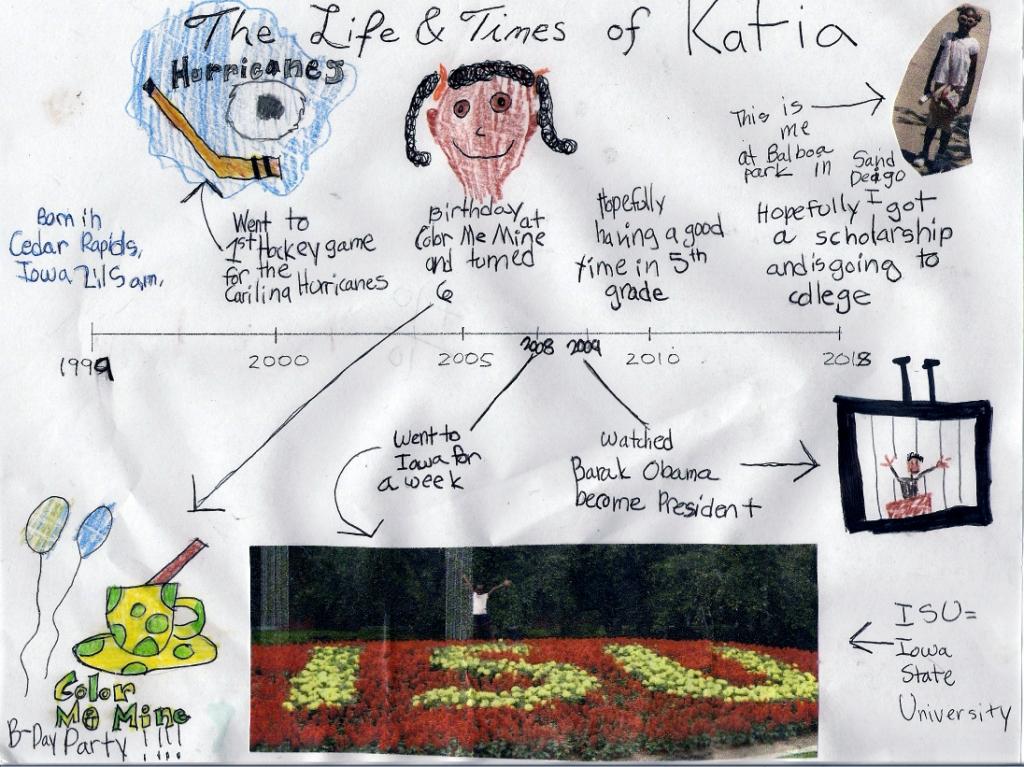 Katia had to make a time line of her life for a school assignment. Her mom helped her with it. It was interesting to see what milestones they picked out, which ones she remembered, and what she planned for the future. All I’m asking is “What happened to 2001-2004!? :)