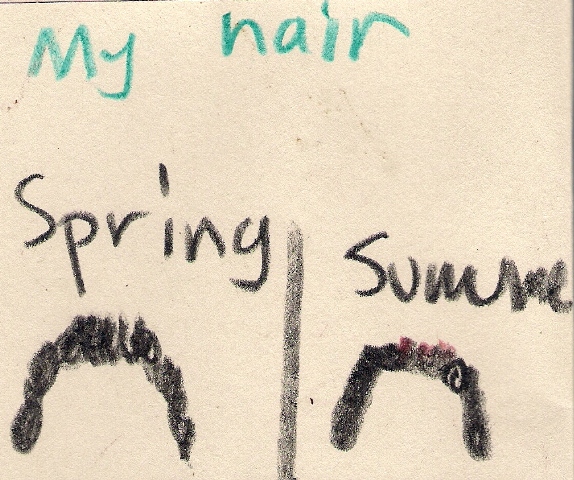 Katia’s Hair Posted on November 13, 2009 by Michael Katia is always telling people about how her hair changes color in the summer. This time she drew a picture. Can you see the difference?