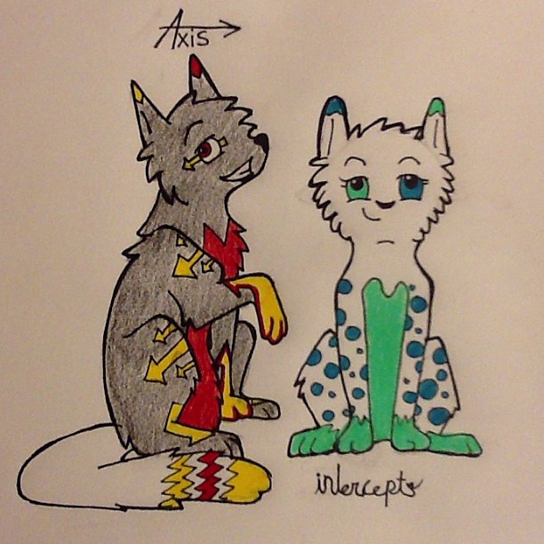My characters!! I love them :3 lol they're based on math Axis: He's kind of obsessed with himself. He loves to wave his tail around in Intercept's face, since hers is short. He spends hours looking in the mirror, grooming his fur, and admiring his arrows. Axis is Skinny and fast, although not too smart, and also good looking.Intercept: She's the opposite of Axis. She's… Well… Round! She has round ears, round paws, round body and face. She's got a short tail Axis likes to make fun of, but she simply teases back that it looked like he got stabbed in the eye. She's smart and naturally pretty.I will definitely be using these two :D image Info Hey! Check out my latest post from Instagram: . ~Katia