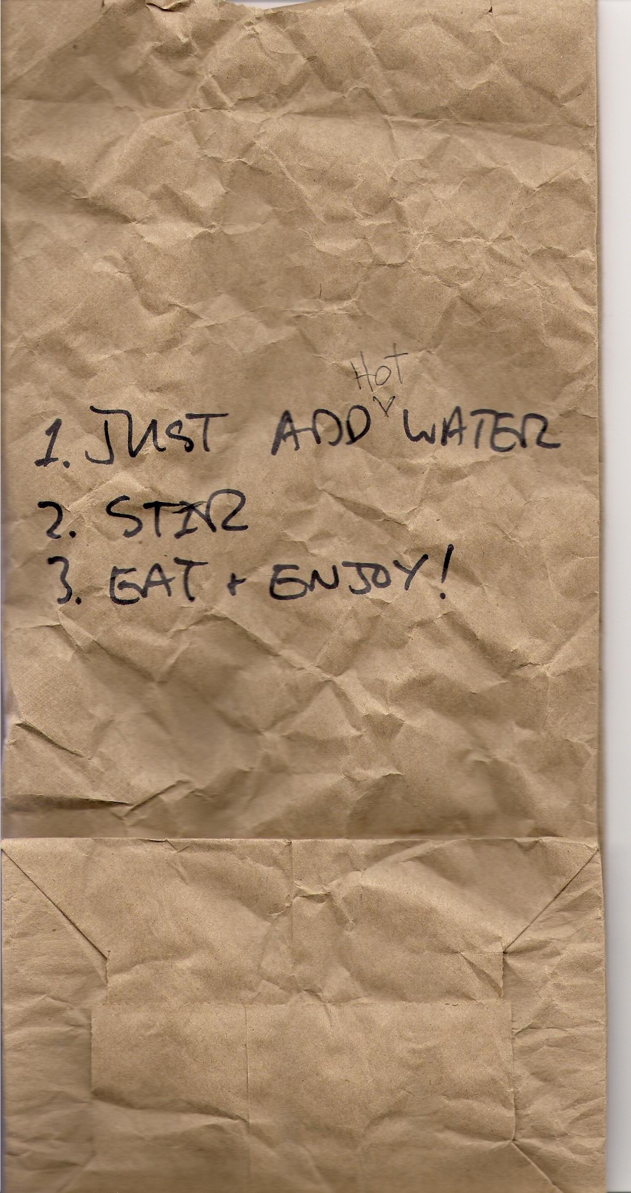 This is the back of the oatmeal lunch bag. It has the directions for making a tasty bowl of instant oats. Turns out, I was missing a very important part of the directions. Katia added it afterwards.