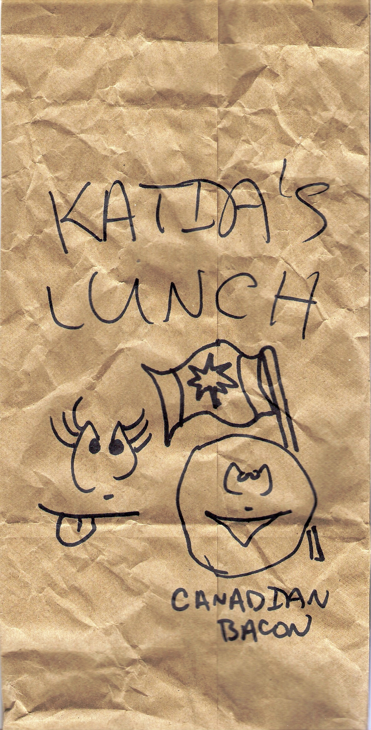 Katia’s lunch usually includes ham or turkey from one of our favorite grocery stores, Trader Joe’s. We stop there on Monday after school and load up on all the stuff we’ll need for the week. Turns out that on this particular week, they didn’t have the turkey OR the ham that Katia likes. We decided to try out the Canadian bacon. It was a hit! Katia loved it. We decided we should let Canadian bacon show its colors on a lunch bag.